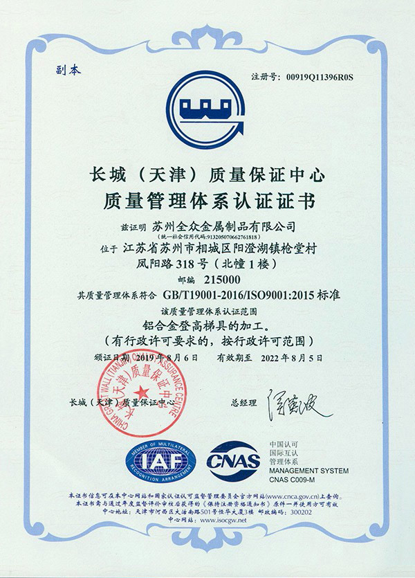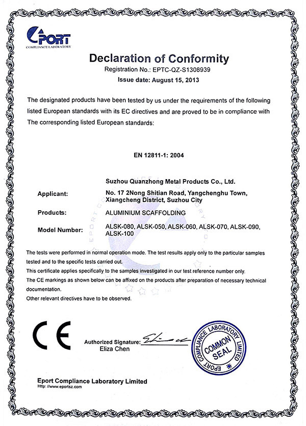 MILE·米乐(集团)官方网站专注铝合金制品的开发“产品就是人品”的企业理念,不断进行技术创新、设备创新、服务创新、和管理方式创新来继续研发出更多满足未来发展需要的产品, 公司产品通过欧盟认证取得CE认证并取得证书,铝合金脚手架系列产品通过SGS认证,铝合金平台和梯具类产品均严格按照GB12142-2007,GB17888等标准设计生产。
